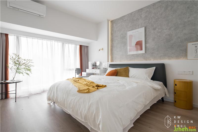 臥室等靜區(qū)鋪的木地板,是出于給予雙腳舒適的人性化考慮。主臥配色偏莫蘭迪色系,給人低調(diào)、朦朧、優(yōu)雅、溫柔之感。