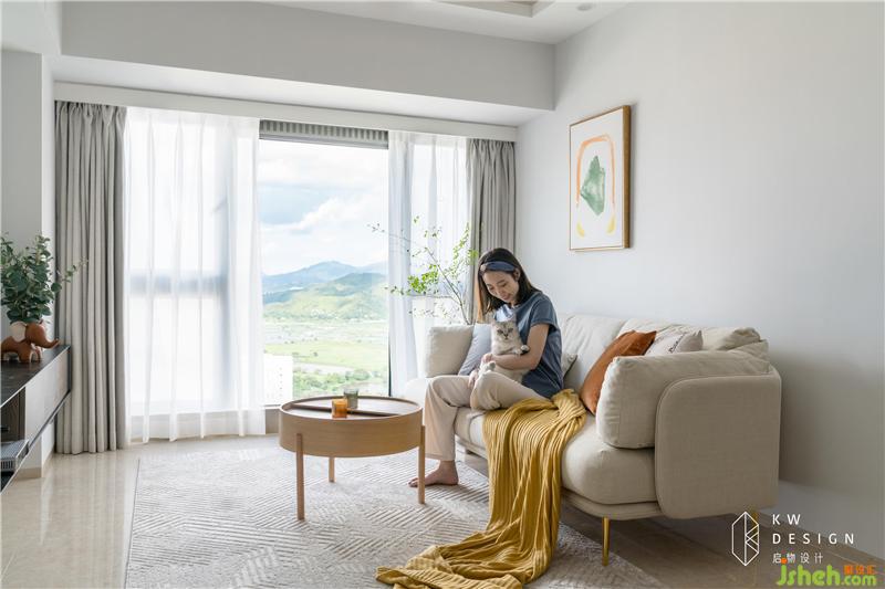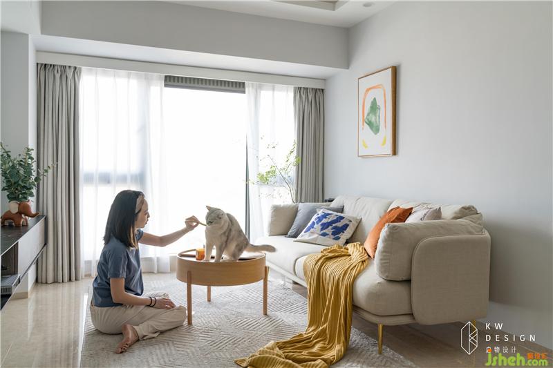 臨近落地窗:客廳換了一副窗明幾凈,歲月靜好的模樣。品質(zhì)感滿分的米色布藝沙發(fā)搭配蜜糖色抱枕、淺黃色席子明快溫暖。原木小圓桌精致輕巧,喵主子可以自由穿梭。