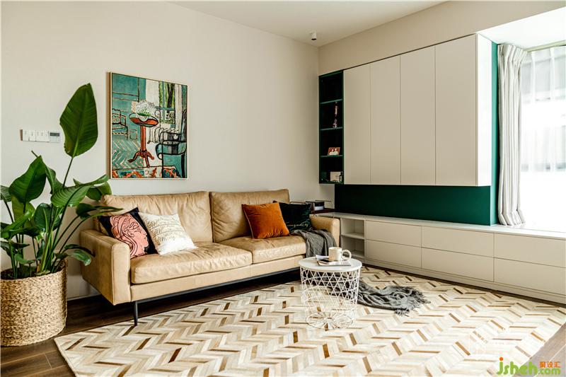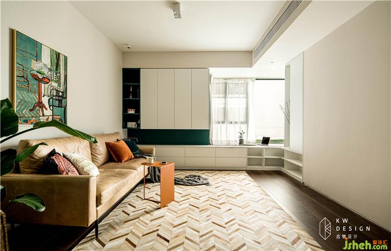 復(fù)古焦糖棕的雙人沙發(fā),愛(ài)馬仕橙的簡(jiǎn)約邊幾,暖棕拼接式牛皮毯,景觀效果極佳的鶴望蘭,室內(nèi)設(shè)計(jì)師和整個(gè)空間元素互相呼應(yīng)協(xié)調(diào)統(tǒng)一的裝飾掛畫(huà),每一處細(xì)節(jié)無(wú)不彰顯屋主的生活態(tài)度和品質(zhì)享受。