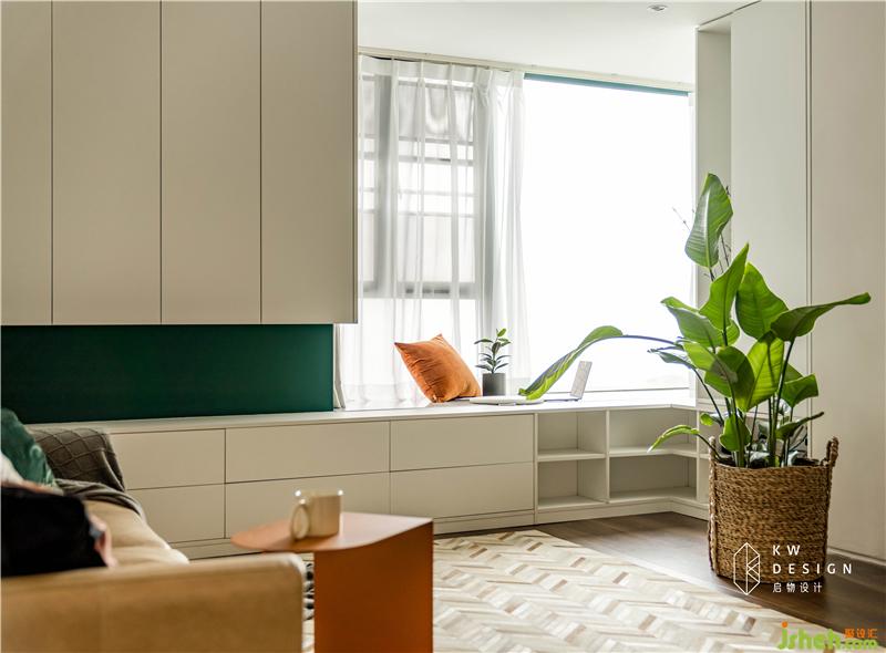 飄窗位置加出30公分深儲(chǔ)物柜,形成一個(gè)臥榻,考慮西曬問(wèn)題平鋪一塊白色大理石面板,為屋主提供一處休閑觀景的愜意角落。