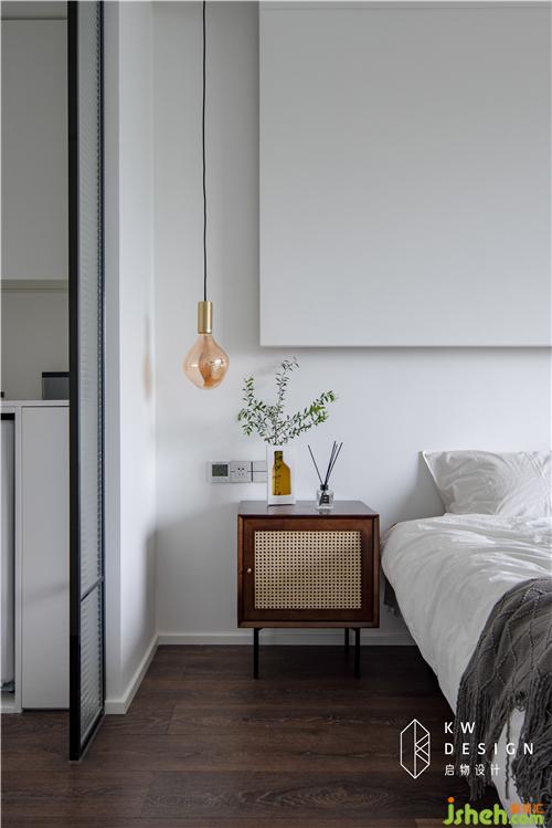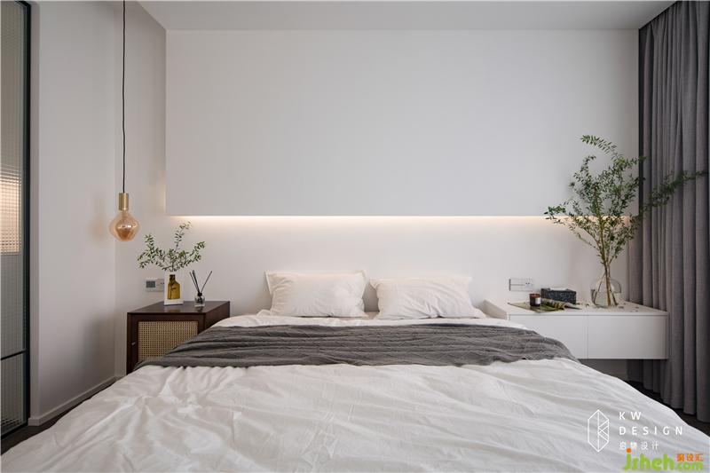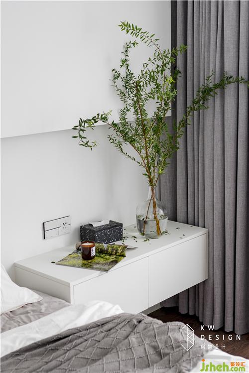 定制懸挑床頭柜呼應(yīng)空間形態(tài),搭配灰色床品和窗簾,干凈素雅。