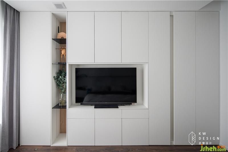 將近4米定制柜體墻面滿足超大收納功能同時(shí)兼具展示和視聽(tīng)功能。