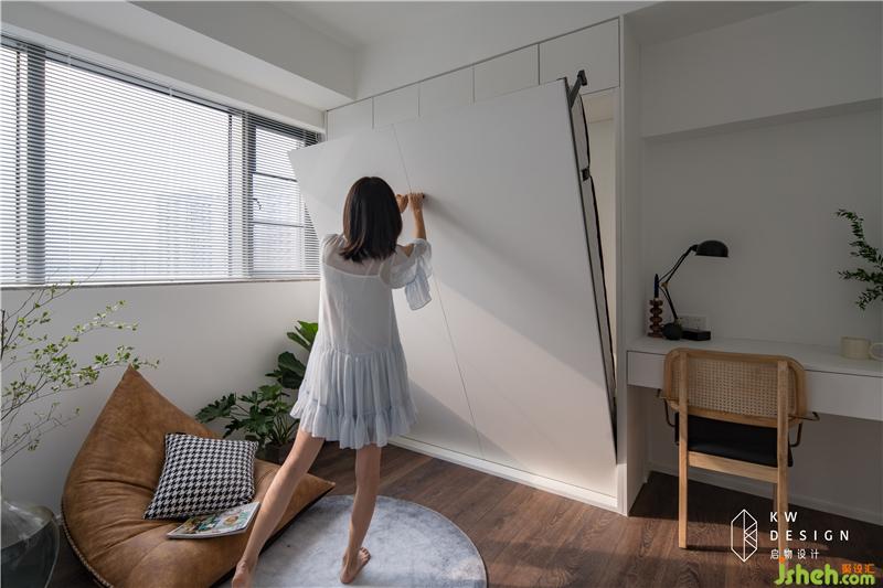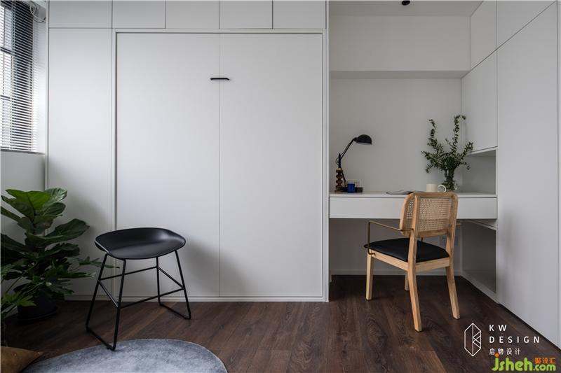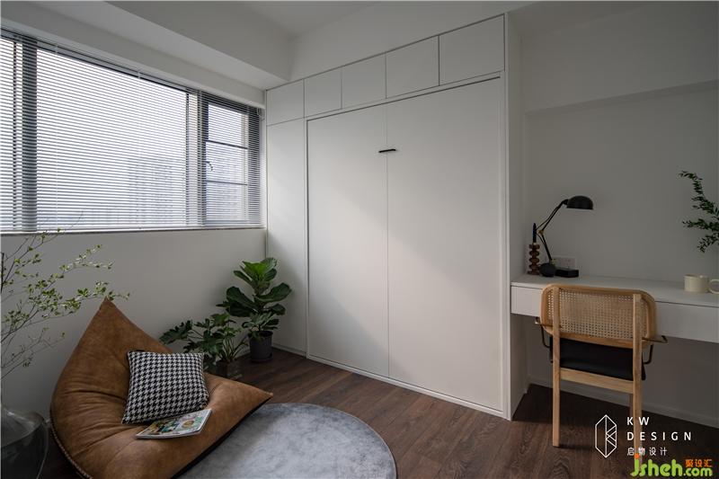 多功能房更多的是做為兩位主人同時(shí)辦公休閑空間,偶爾做客房,采用隱形翻板床的形式解決客臥功能,把更多的空間留給主人根據(jù)不同時(shí)期需求更換功能使用,閑暇時(shí)擺上懶人沙發(fā)和綠植,是專屬兩人互相陪伴的愜意時(shí)光,以后也可以是寶寶活動(dòng)玩耍的空間。