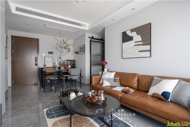 原精裝房的淺灰色地磚還是蠻百搭的,要是啞面材質(zhì)就完美了??梢钥吹讲蛷d并不大,如果再擺上冰箱,空間就去掉大半了。