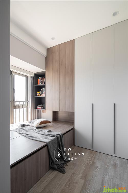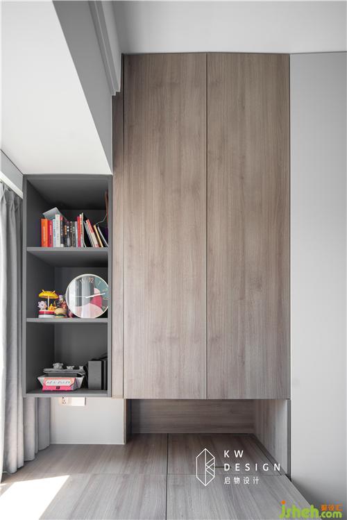 多功能房采用深色沉穩(wěn)木色和亮白色面板做拼色設(shè)計,灰色開放格點綴。超大收納空間,Kelly可以放肆海淘了。