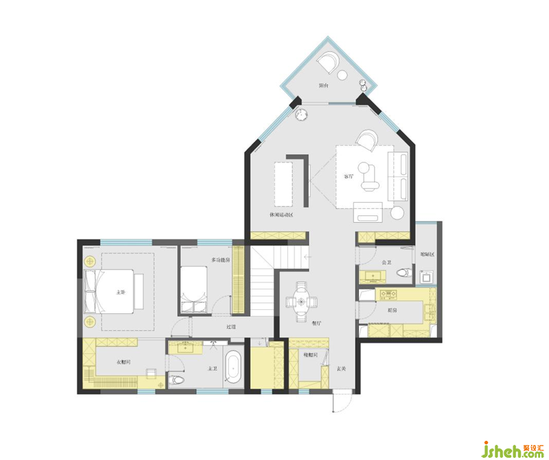 一樓作為屋主的社交區(qū),希望有麻將打牌的地方,聚會(huì)氛圍要滿足,還需要有獨(dú)立空間平時(shí)做瑜伽運(yùn)動(dòng)。二樓作為靜區(qū),女孩子喜歡的的衣帽間和浴缸也是必不可少的。