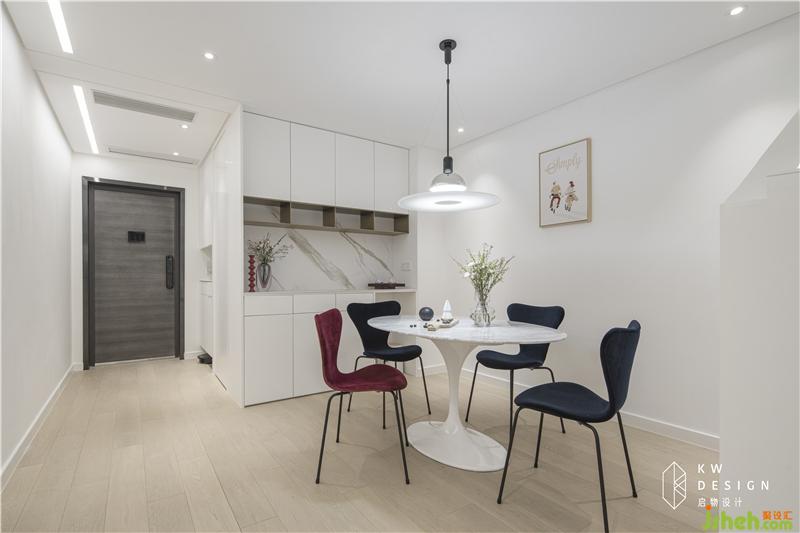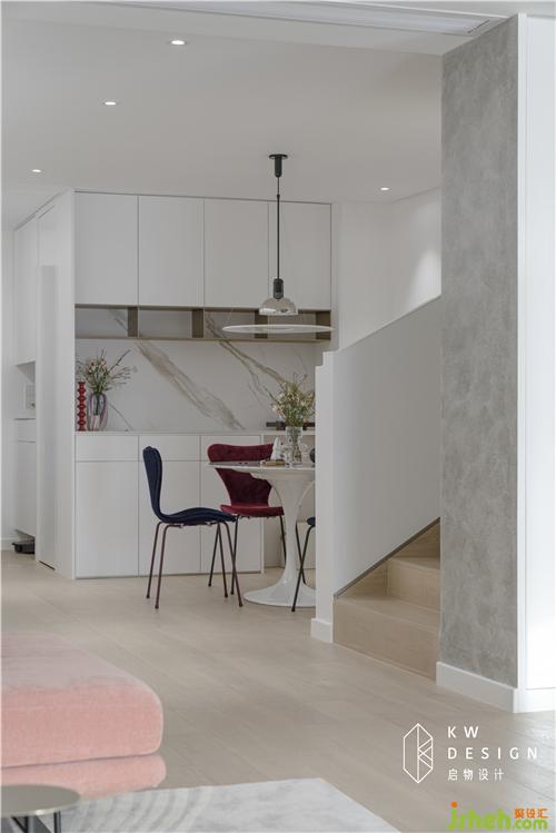 玄關(guān)和餐廳原本采光不佳,室內(nèi)設(shè)計(jì)師采用大面積的白色打底(柜子,墻,吊頂,門),另增加光源,明亮空間。吊頂靠墻內(nèi)凹做陰影縫避免后期天花與墻體的接縫處開(kāi)裂,搭配遞進(jìn)燈帶,凸顯光影立體效果,增加進(jìn)門的氛圍感和儀式感。