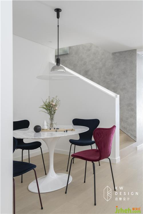 跳脫傳統(tǒng)餐桌非圓即方的思維,這次我們選的是橢圓形的雪花白大理石餐桌,增加空間的趣味性,柔美的曲線造型搭配絲絨蝴蝶椅,皇室藍(lán)和勃艮第紅裝點(diǎn)純白空間,優(yōu)雅的Flos frisbi吊燈提供溫馨氛圍,在這樣時(shí)尚與精致的用餐空間里,是味蕾和視覺(jué)的雙重享受。