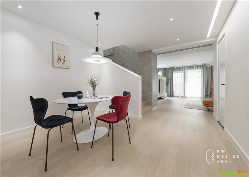 從樓梯看下餐廳,1.4m的餐桌可以容納8個(gè)人。