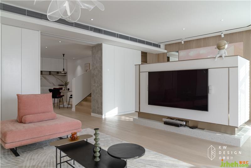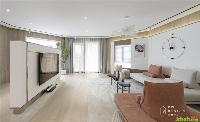 因?yàn)榭蛷d的采光不錯(cuò),與餐廳的配色形態(tài)是區(qū)分開(kāi)的,五邊形的結(jié)構(gòu)室內(nèi)設(shè)計(jì)師希望營(yíng)造的是圍合,包覆的感覺(jué),無(wú)論是獨(dú)處還是聚會(huì),都有不同的氛圍感受。所以沙發(fā)背景的隔屏,電視墻的造型以及天花軌道燈的設(shè)計(jì)都是以半圍合的形式。