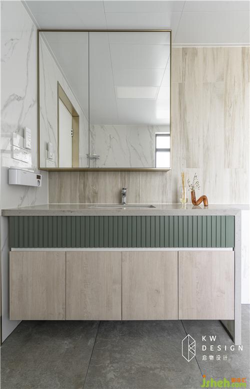 屋主很喜歡原木的質(zhì)感,所以把原木色也延續(xù)到衛(wèi)生間,不過是以木紋裝上墻的形式,搭配爵士白墻磚也是很好看的。