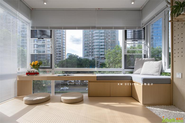 將老舊露臺納入室內(nèi),沿窗設(shè)置可臥可坐的休閑平臺,激活了整個北面的窗邊景色,讓陽光可以穿透進(jìn)室內(nèi)來。