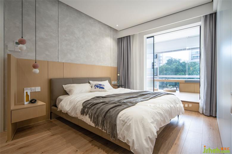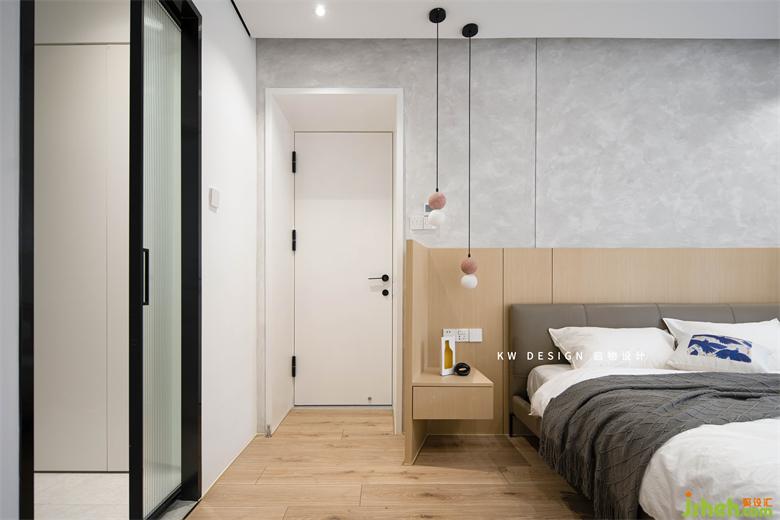 水泥灰與溫潤(rùn)木色的沖突美感延續(xù)至主臥。床屏連接床頭柜為一體做了包覆的圍合形式,深圳家裝設(shè)計(jì)為睡眠空間增添舒適安全感。