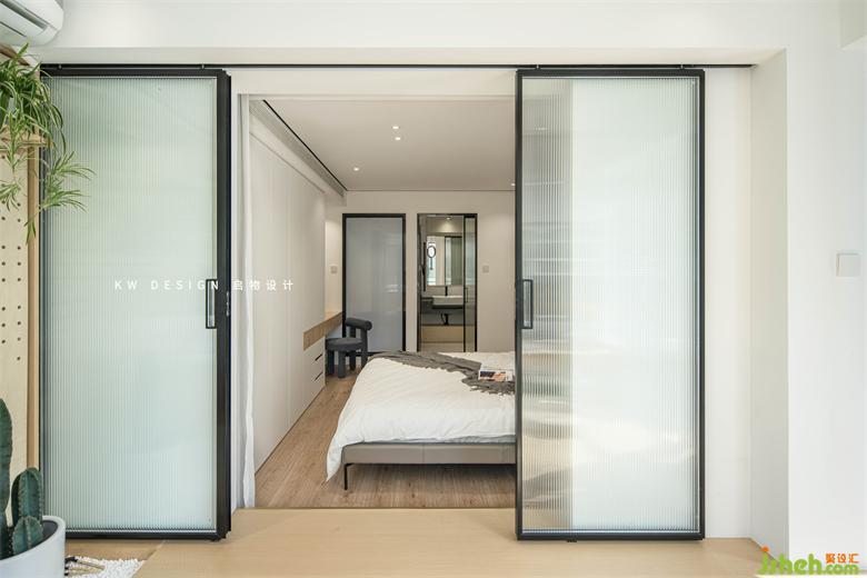 陽(yáng)光房看向臥室。長(zhǎng)虹玻璃的移門(mén)采用吊軌,深圳家裝設(shè)計(jì)留定位器可控制開(kāi)合距離。