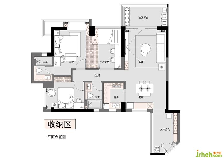 2:原本入戶玄關(guān)到客餐廳是有門套加以分區(qū)的,拆掉門套,地板通鋪??臻g更開闊,利于采光通風(fēng)。主臥和多功能房之間用兩面墻柜做隔斷墻,兩個(gè)房間都有了充足的隱形收納,一舉兩得。全屋各個(gè)空間都巧妙的留出了收納區(qū)。