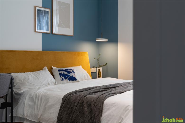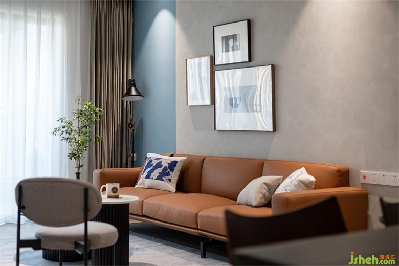 沙發(fā)背景和電視背景都采用了藝術(shù)涂料和藍(lán)色的一個(gè)拼接撞色的形式。這款藍(lán)色不重不淡,沒有北歐的寡淡,也沒有復(fù)古的繁重,偏現(xiàn)代大氣。
