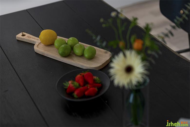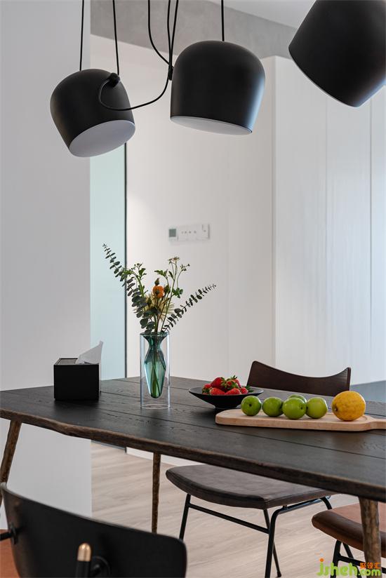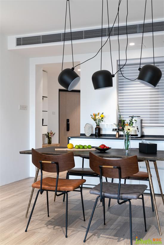 大受歡迎的香格里拉簾透光、保護(hù)隱私還很貌美。餐邊柜臺(tái)面用了黑花紋的盤古巖板。單單白色的柜子未免有些單調(diào)。且?guī)r板臺(tái)面精致、好打理。
