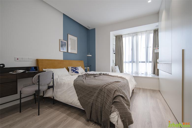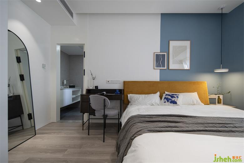 主臥無主燈設(shè)計(jì),采用反光燈帶、邊角吊燈、燈泡凹陷射燈等間接燈光來照明。背景采用客廳同款藍(lán)色局部色塊加以點(diǎn)綴。家裝設(shè)計(jì)因?yàn)槲葜飨矚g家里明亮一點(diǎn),所以全屋基本保持白墻。都是小面積使用藍(lán)色色塊。