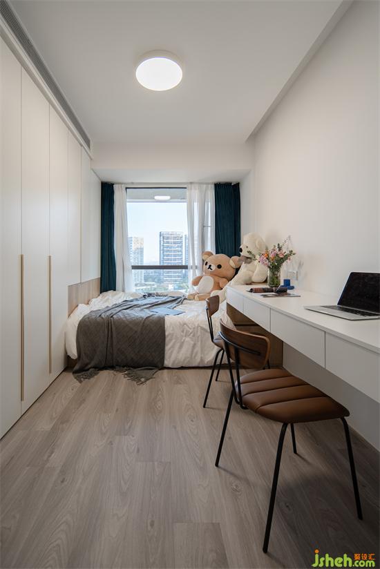 榻榻米延伸到飄窗臺(tái)上面,利用飄窗臺(tái)。雙人書桌加滿墻的收納柜。榻榻米也暗藏收納屜,充分利用空間。