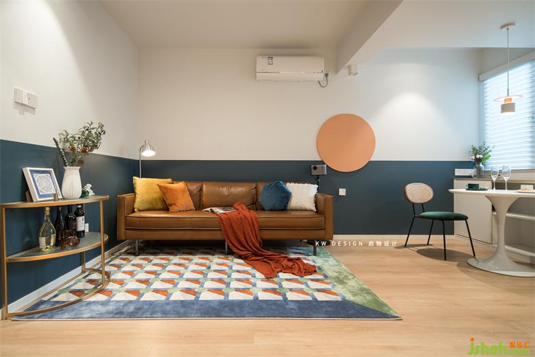 北歐表情的棕色沙發(fā)搭配落地銀色銅燈,精致唯美。家裝設(shè)計拼色幾何地毯幾乎搭上了客餐廳空間的所有色系,仿佛一個集大成者。墻面蔚藍色半墻浮上圓形橙色色塊,不禁讓人聯(lián)想到蔚藍的海面,燃燒似火,懸浮其上的落日,浪漫愜意。創(chuàng)意給空間加分。