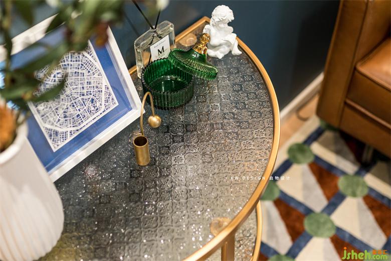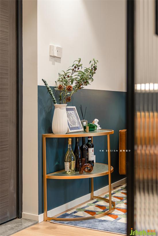 客廳原來放鞋柜的地方換成了置物邊幾,上面擺滿了新奇小物件,鮮花和美酒。是個望之欣喜的小角落。