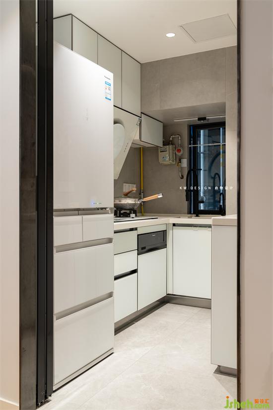 原來(lái)L型的廚房,缺少了備菜區(qū),也沒(méi)有可以放置冰箱的區(qū)域。移墻后,L型廚房改造成u型廚房,操作臺(tái)面擴(kuò)大,功能更齊全,增加了收納。