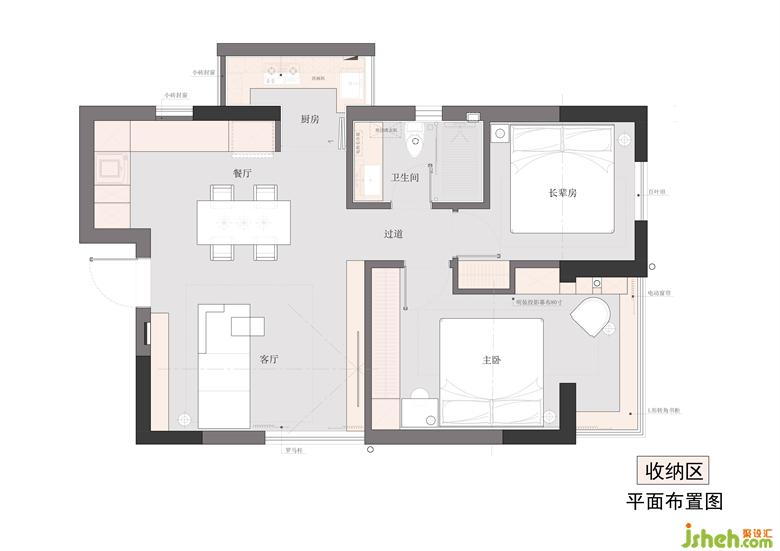 3. 公領(lǐng)域收納由進(jìn)門向兩側(cè)沿墻設(shè)置,以1.8m大餐桌為中心的回游動線弱化空間邊界,無形放大公領(lǐng)域空間尺度呈現(xiàn)開放舒適感。