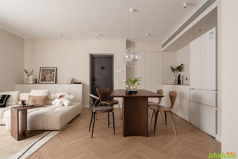 全屋通鋪人字紋木地板,與簡約的天花對比出空間張力,空間上以清新奶白的溫潤材質(zhì)和色系為主,景新花園家裝設(shè)計點(diǎn)綴深沉棕的樸實(shí)質(zhì)感,渲染人文休閑氣韻和清透無壓的愜意氛圍。