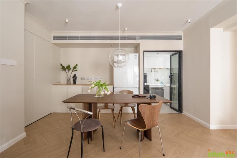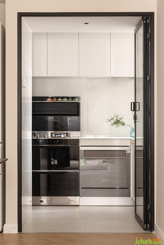 餐廳與廚房砌了一面薄墻使餐邊柜和冰箱呈內(nèi)嵌狀態(tài),景新花園家裝設(shè)計(jì)削弱收納的厚重體量,同時(shí)也拓展了廚房的徑深騰挪出折疊推門的收納位置,而不影響廚房的正常使用。
