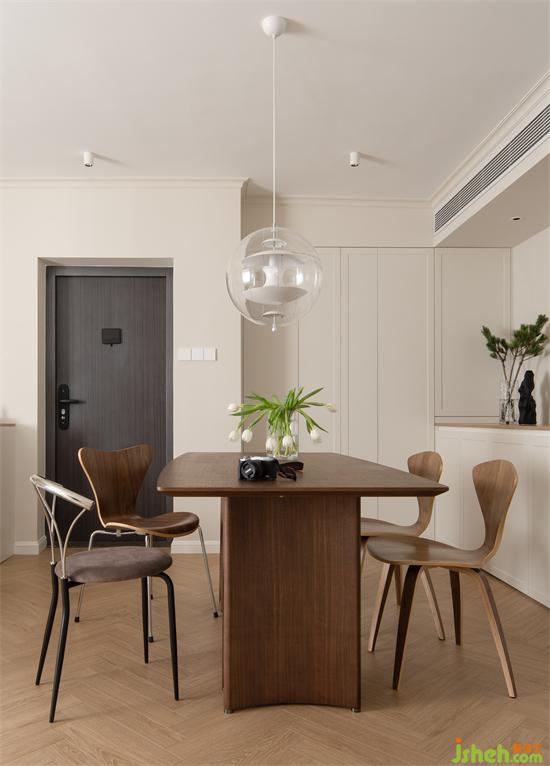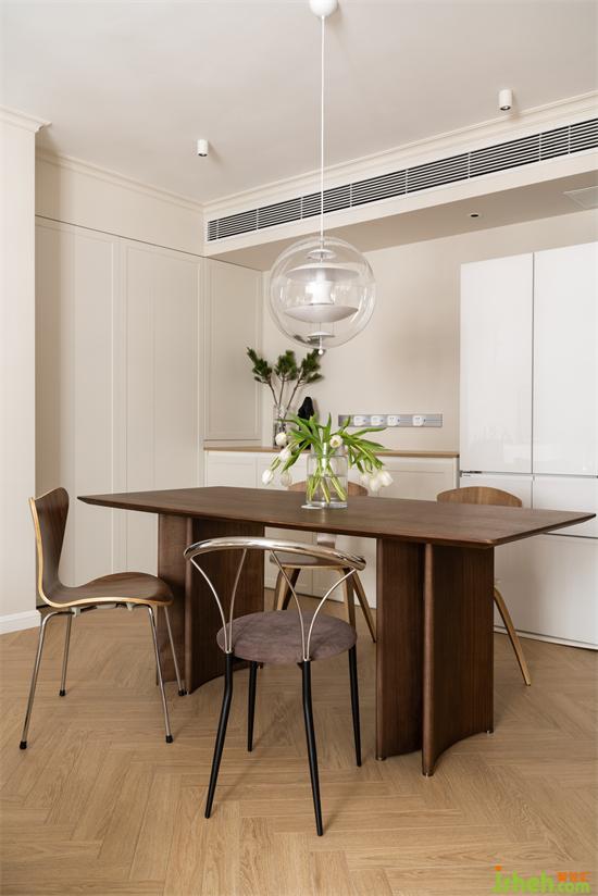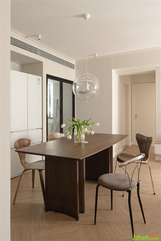 公領(lǐng)域唯一的主動(dòng)是餐廳的星球吊燈,透明輕盈的球星框架搭配內(nèi)部金屬片,宛如無重力的空間漂浮,景新花園家裝設(shè)計(jì)搭配中古餐桌和不同形態(tài)的餐椅,一深一淺,一實(shí)一虛,一方一圓,簡單也豐富,多樣也統(tǒng)一。