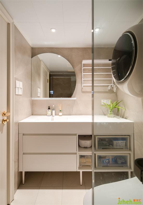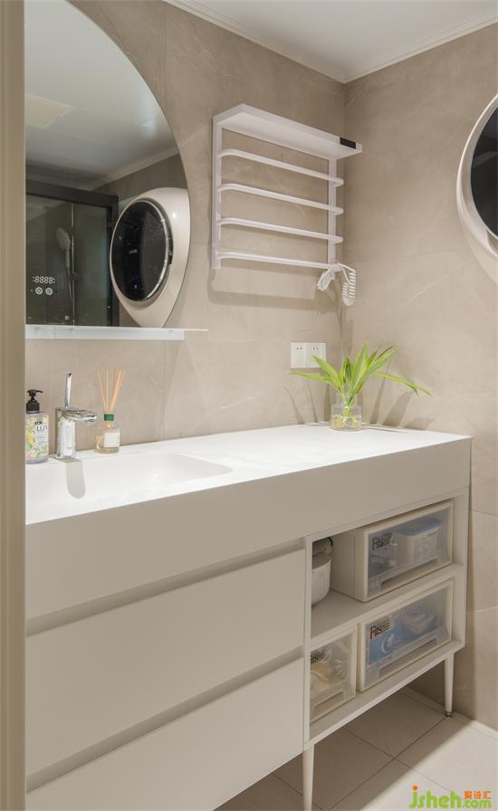 向次臥拓展了90公分開間剛好做淋浴區(qū)。浴室柜也得以延長至1.4m多,景新花園家裝設(shè)計(jì)大臺面和下方的強(qiáng)收納裝點(diǎn)女孩子的精致洗護(hù)日常。
