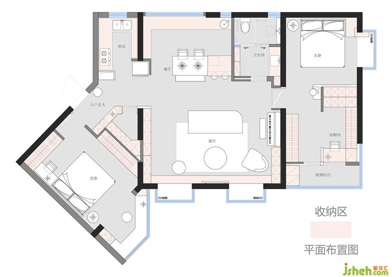 3. 廚房改變進(jìn)門方向由冰箱連接餐廳,櫥柜從L形布置變?yōu)楦呃寐实膗形布置。