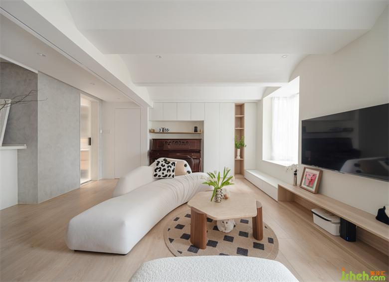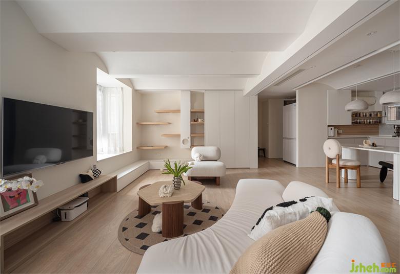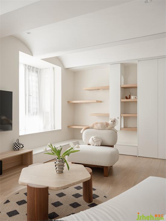 5. 重新規(guī)劃的大開間客廳取消傳統(tǒng)的布置,沿墻分別設(shè)置收納和貓咪活動區(qū),中間向自然光源布置功能家具,呈現(xiàn)圍合開放靈動的休閑生活領(lǐng)域。