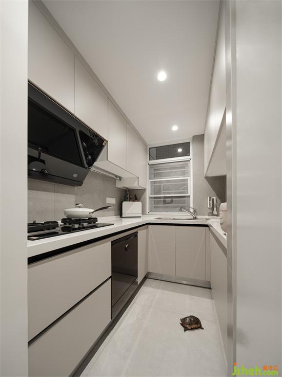中廚改變了進(jìn)門方向朝向過道,金桂大廈家裝設(shè)計獨立的烹飪區(qū)避免了爆炒時噪音與油煙對客餐廳的影響,U型櫥柜上下做滿了收納,80公分的過道是小烏龜?shù)娜粘;顒訁^(qū)。