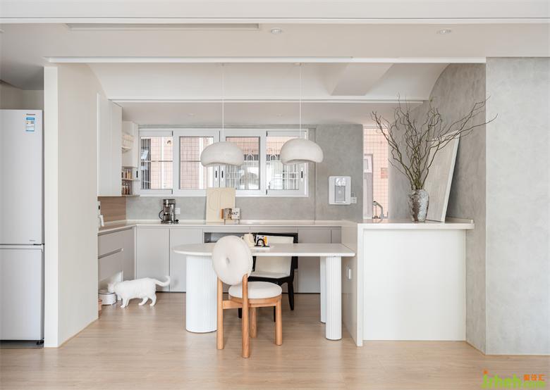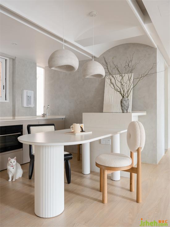 與客廳的彈性布置不同,餐廳常態(tài)化的生活場景更需要考究尺度和布置,連接客廳與輕食區(qū)的餐桌采用圓潤的形體,金桂大廈家裝設(shè)計白色塊面虛實交疊弱化分界,由自然流暢線條勾勒連接用餐儀式。