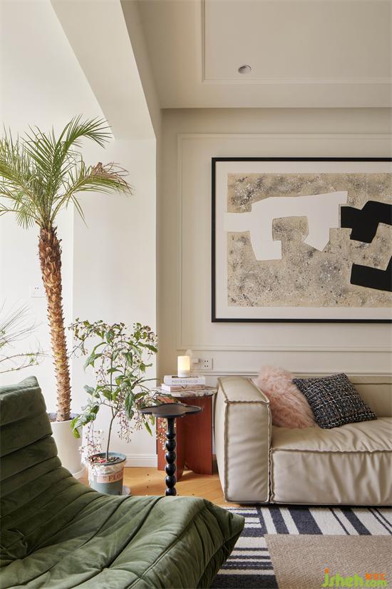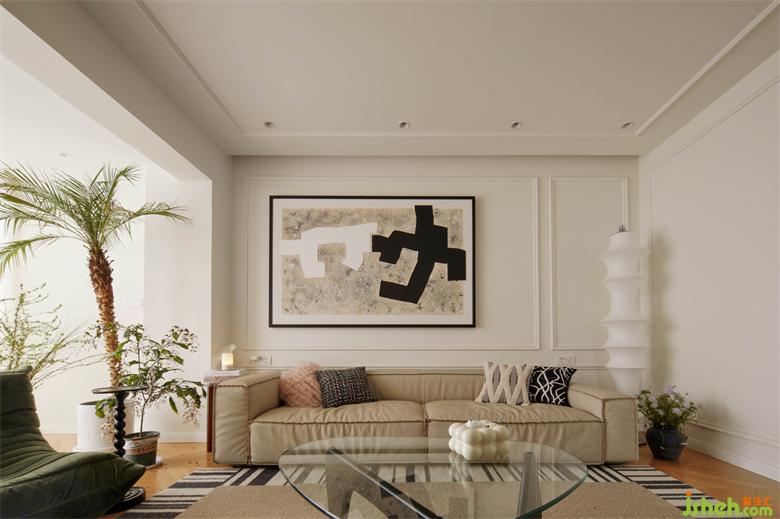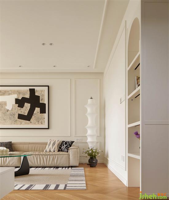 全屋無主燈設計,佳兆業(yè)悅峰復式裝修設計通鋪人字拼地板,簡單的對稱結構裝飾奶白立面,豐富的軟裝配飾元素融合在中性柔和的大基調里,打造兼具功能與審美的獨特家。
