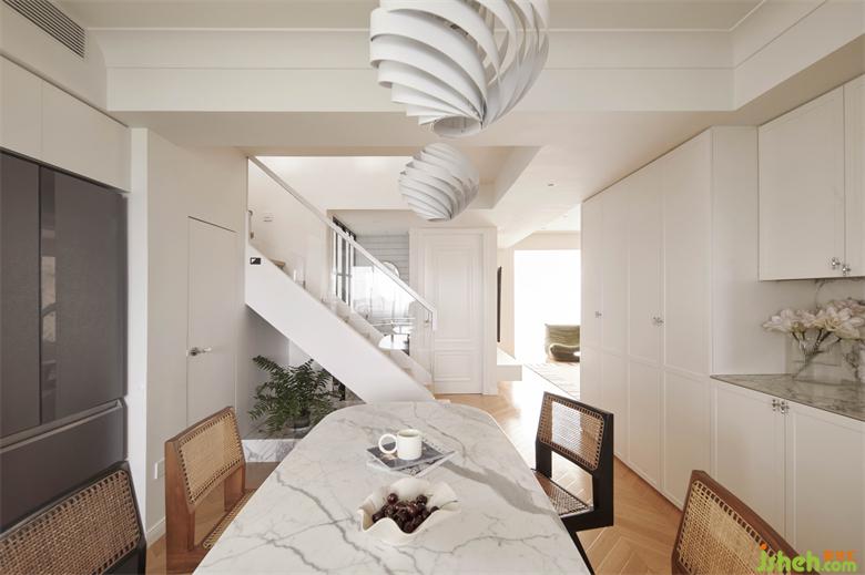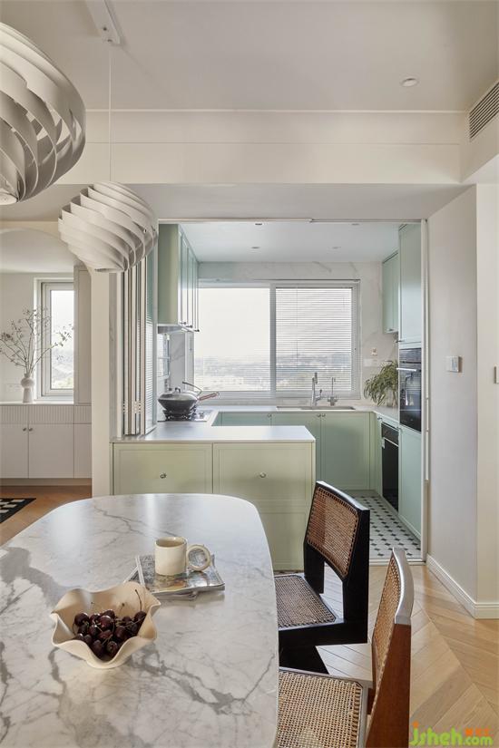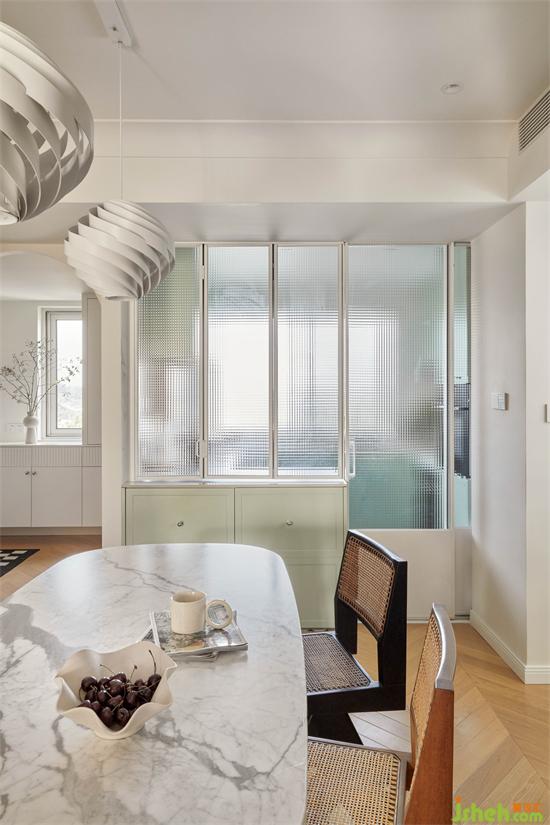 6平方米的半開放式廚房采用折疊窗和移門可靈活閉合,佳兆業(yè)悅峰復式裝修設計滿足了羊羊對開放式廚房的執(zhí)念,兼具美觀與實用。