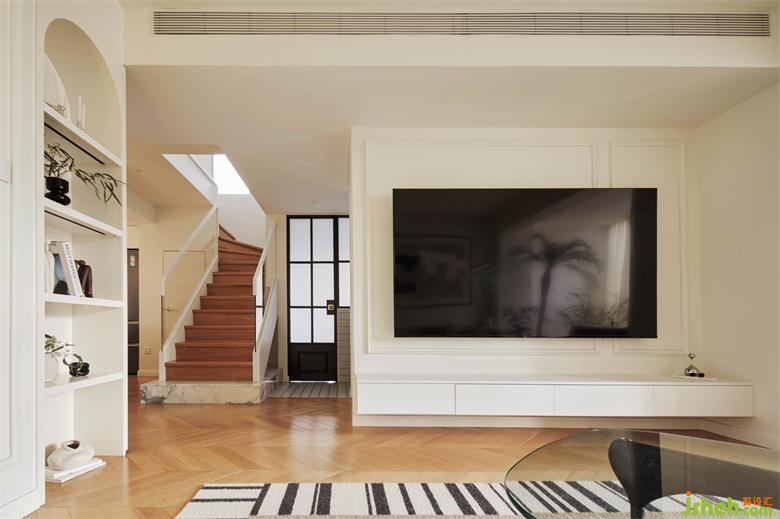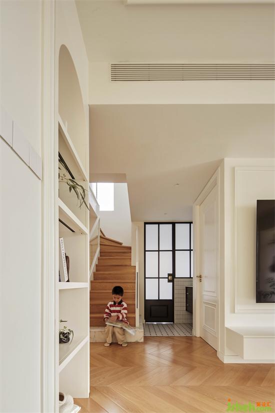 原先由餐廳到客廳的轉(zhuǎn)彎處是兩個拐角相沖,過道擁擠,把長輩房進(jìn)門位置內(nèi)進(jìn)后擴(kuò)大了轉(zhuǎn)角空間,佳兆業(yè)悅峰復(fù)式裝修設(shè)計一側(cè)做弧形開放層板,另一側(cè)做懸挑柜補充客廳收納,弱化生硬轉(zhuǎn)角,舒適順暢的生活動線也得以釋放。