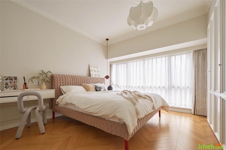 以軟裝烘托意境來打造輕法式浪漫。一張獨特又溫柔的Ruche床,一盞夢幻復(fù)古的裝飾吊燈就能圍合個性又溫馨的睡眠區(qū)。
