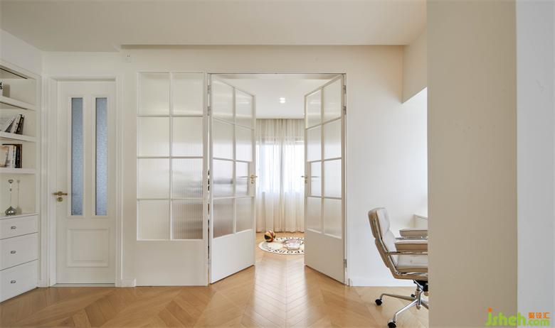 靠近兒童房做整墻收納,上半部分開放格收納書籍,下半部分帶柜門收納小朋友的玩具和其他雜物。多功能房打開與外部空間連成一片,開闊舒適的活動區(qū)承載豐富的育兒場景和休閑娛樂需求。