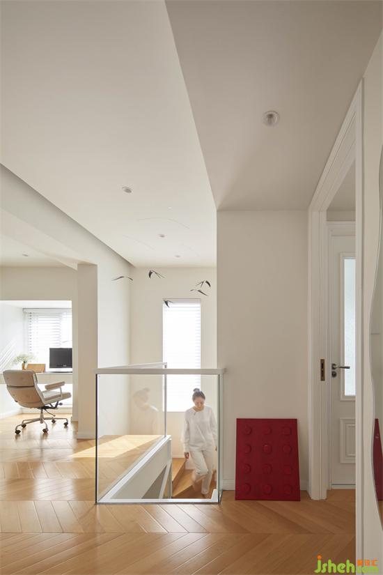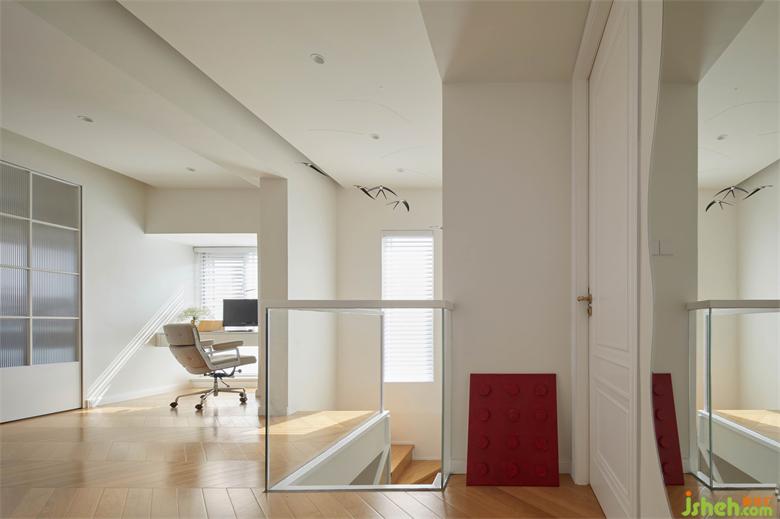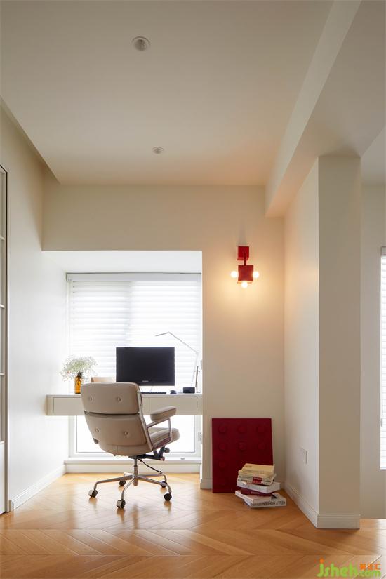 靠窗凹位定制書桌作為羊羊和先生臨時辦公的區(qū)域,旁邊空位預(yù)留壁燈作閱讀角。佳兆業(yè)悅峰復(fù)式裝修設(shè)計紅色裝飾點綴能很好調(diào)動小朋友的情緒,增加活力。兼具陪伴與互動的空間幫助小朋友成長。