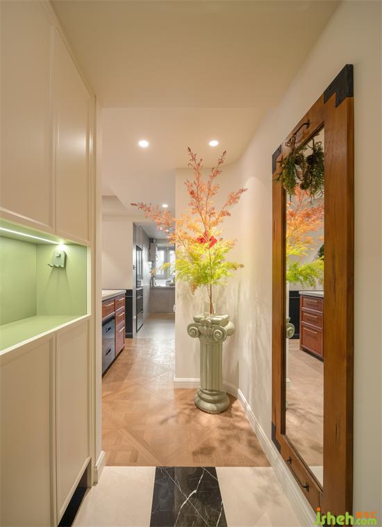 玄關(guān)黑白格子拼地磚作落塵區(qū),鞋柜對面設(shè)全身鏡,方便進出門整理收拾。與廚房墻體銜接處作了圓弧過渡,由半高羅馬柱搭配綠植花卉或擺件設(shè)一處法式浪漫端景,千層金花語:與眾不同。正契合這個獨一無二的新家。
