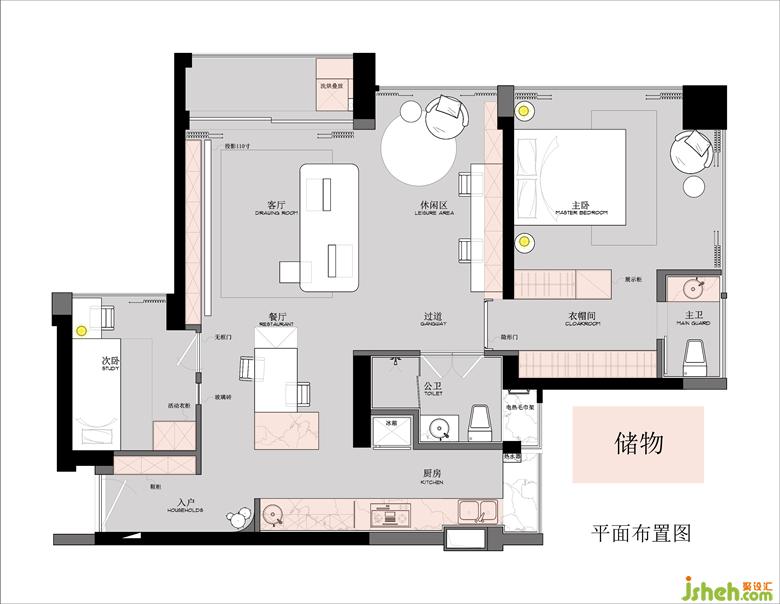 3. 每個空間沿墻獨立設(shè)置兼具實用與展示收納區(qū),功能家具居中擺放釋放靈活的洄游動線空間。