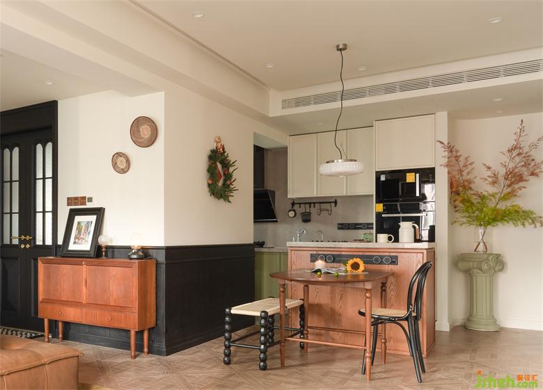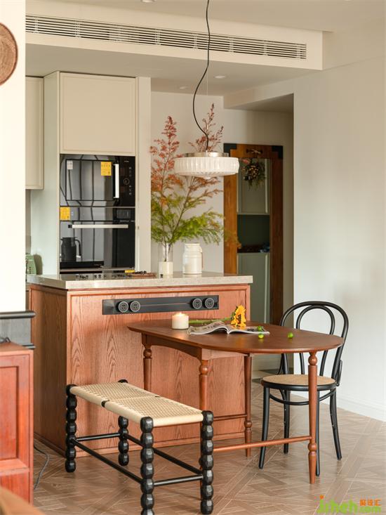 近乎正方形的餐廳空間,兩邊預(yù)留動線,活動餐桌連接固定餐島臺打造圍合餐廚區(qū)。海納公館家裝設(shè)計無論是輕食簡餐,還是午后休閑夜晚小酌,還是多人聚會的備餐操作皆可輕松實現(xiàn),空間利用率滿滿。