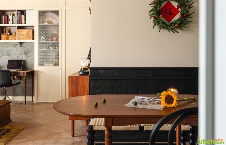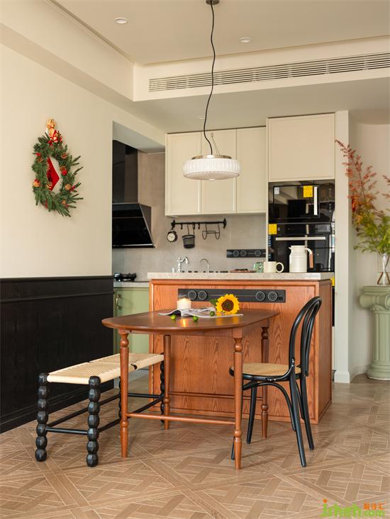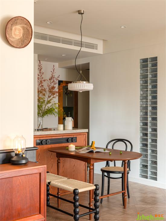 深柚木餐桌搭配藤編餐椅融合古典與自然,太陽花造型的白玉玻璃吊燈,海納公館家裝設(shè)計為用餐區(qū)增添濃厚年代氛圍感。