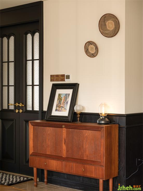 黑色水曲柳護墻板連接過渡至公衛(wèi)主臥,過道轉(zhuǎn)角處立一只古樸斗柜收納物件同時作展示臺,墻面裝飾屋主海淘的湯加草編盤。