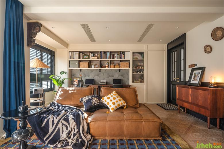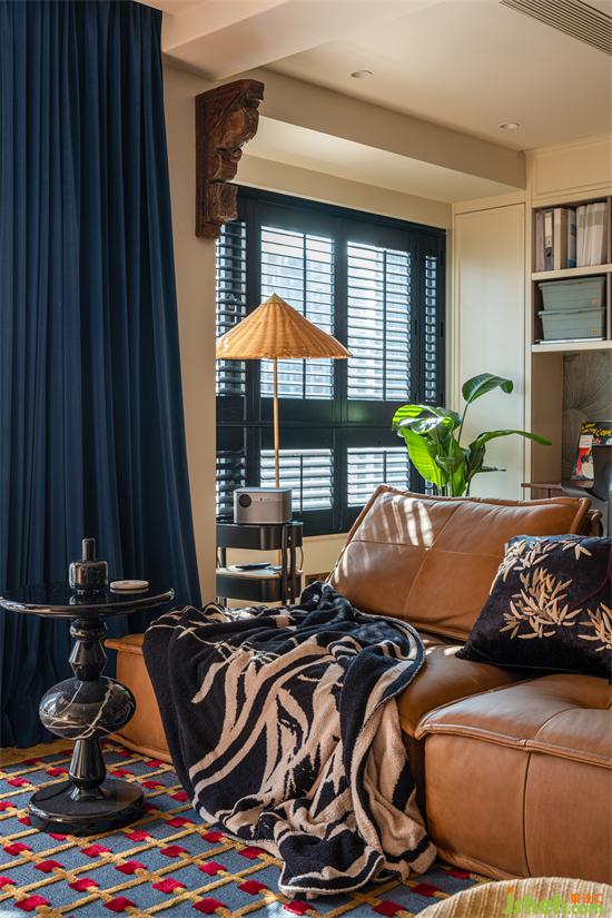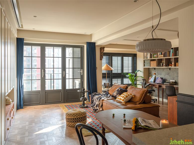海納公館家裝設(shè)計引入“窗大門闊,明亮通風(fēng)”的建筑樣式,5米多的大開間由玻璃和百葉透進的光暈渲染窗明幾凈,復(fù)古空間飽滿而通透。