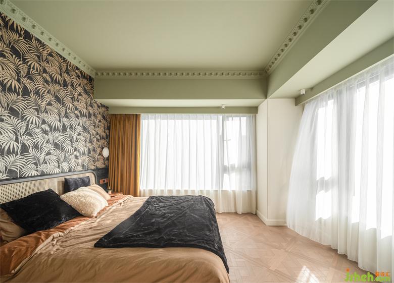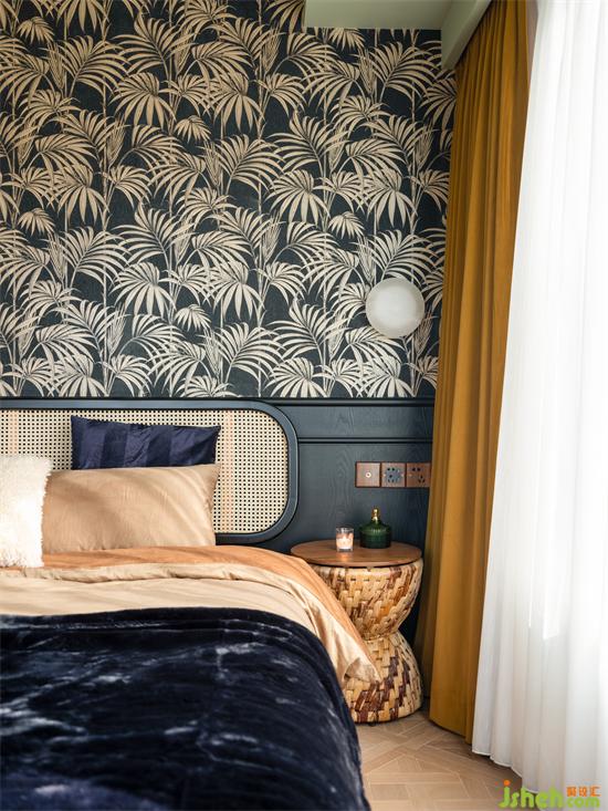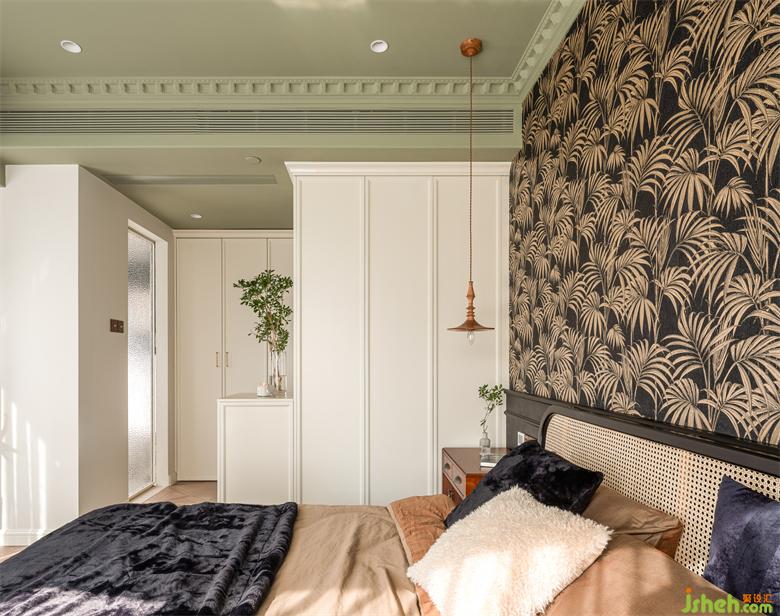 睡眠空間用色更加跳脫大膽,南洋風不可缺少的清涼與熱烈由墻至頂大面積渲染,床頭背景采用黑白相間的棕櫚葉裝飾壁紙,抹茶綠鋪陳天花,具象的綠意與夢幻的香薰裝點其中,為空間注入大自然的生機以及探索的神秘感。