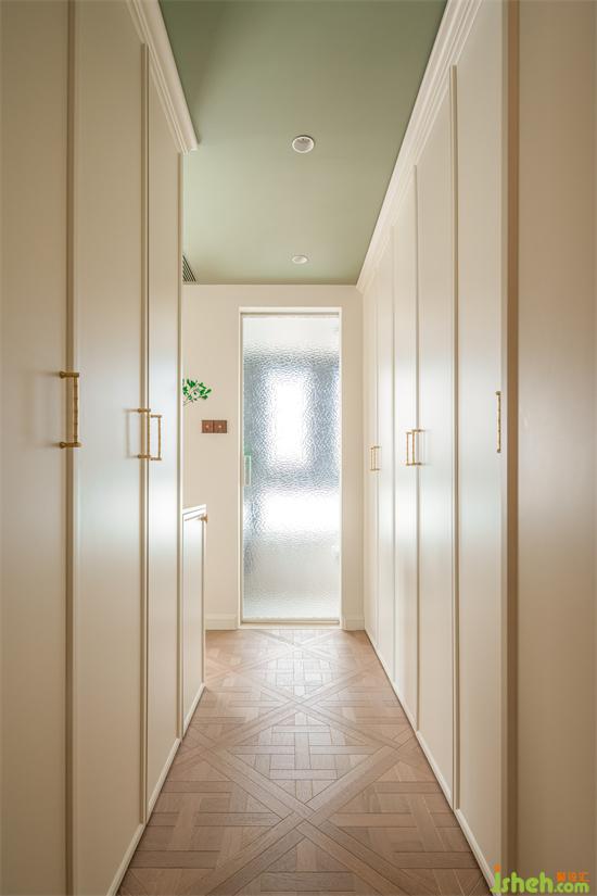 主衛(wèi)推門采用水波紋玻璃,自帶復(fù)古氛圍感,干凈清爽也易打理,海納公館家裝設(shè)計即使在房門打開過道對著公共空間的時候也能帶來油畫般的視覺感受。