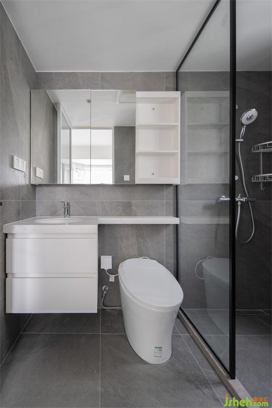 不同于干區(qū)的細膩和繽紛,濕區(qū)通鋪粗狂紋理的灰色柔光磚,簡單干練也好清潔。